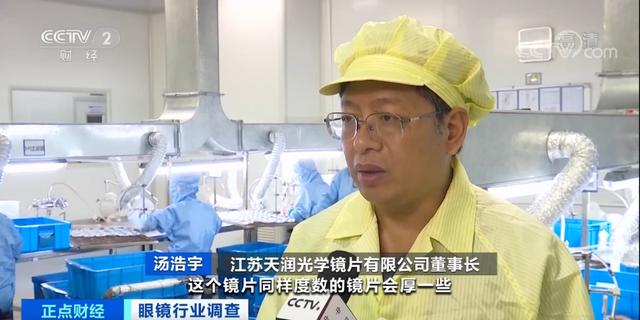 江苏天润光学镜片有限公司董事长 汤浩宇:一般普通镜片折射率相对低一些,同样度数的镜片会厚一些,高档镜片材料更贵,做出来的镜片更加美观,比较薄、比较轻。工厂生产成本,一副在10元到50元左右。